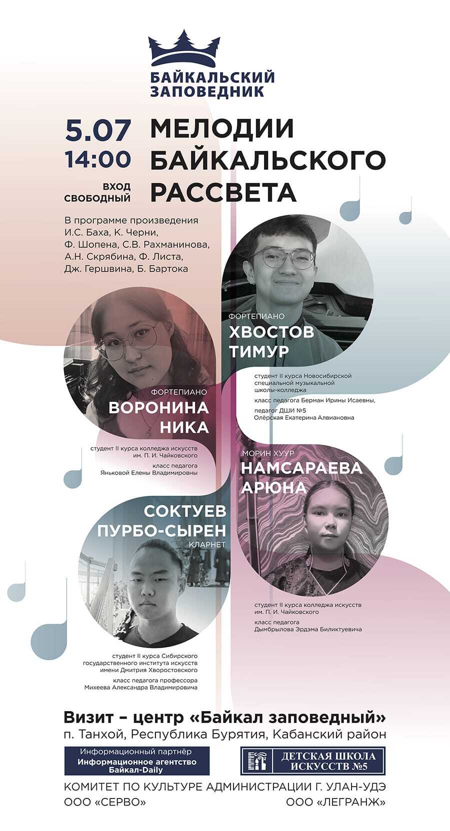 Соктуев Пурбо-Сырен, кларнет. Студент I курса Сибирского государственного института искусств имени Дмитрия Хворостовского, класс педагога профессора Михеева Александра Владимировича, педагог ДШИ № 5 Эрдынеева Евгения Павловна.